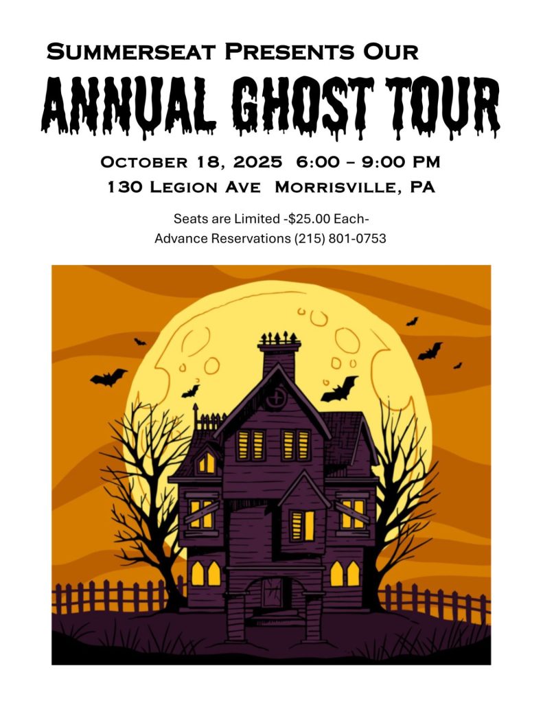 Summerseat Presents: Our Annual Ghost Tour. Come hear spooky stories from colonial days, learn haunted history, and venture into the basement–if you dare! Seats are limited. Reservations required. Call (215) 801-0753.