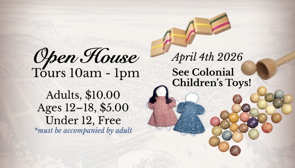 Families with children who attend the Open House will be allowed to tour the rest of the building and will be allowed to see the colonial toys. There is a fee: Children under age 12 are free, Youth age 12-18 are $5.00, and Adults $10.00. Children must be accompanied by an adult to tour the rest of the building during Open House.