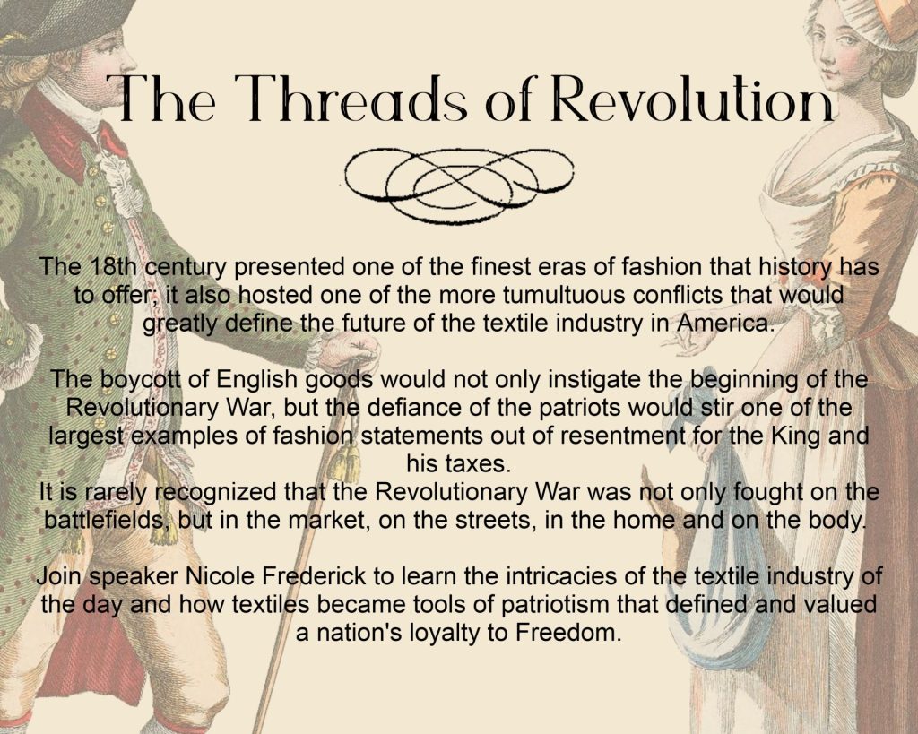 The 18th century presented one of the finest eras of fashion that history has to offer; it also hosted one of the more tumultuous conflicts that would greatly define the future of the textile industry in America. The boycott of English goods would not only instigate the beginning of the Revolutionary War, but the defiance of the patriots would stir one of the largest examples of fashion statements out of resentment for the King and his taxes. It is rarely recognized that the Revolutionary War was not only fought on the battlefields, but in the market, on the streets, in the home and on the body. Join speaker Nicole Frederick to learn the intricacies of the textile industry of the day and how textiles became tools of patriotism that defined and valued a nation’s loyalty to Freedom.